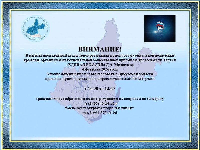 Уполномоченный по правам человека в Иркутской области информирует о приеме граждан по вопросам социальной поддержки