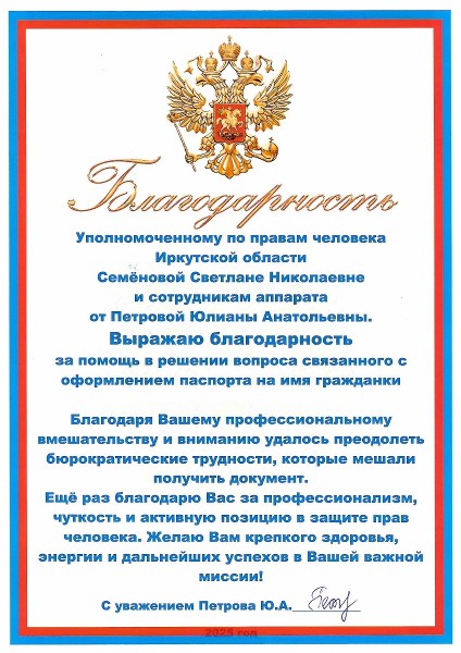 Уполномоченным по правам человека в Иркутской области получена благодарность заявителя за помощь в оформлении российского паспорта