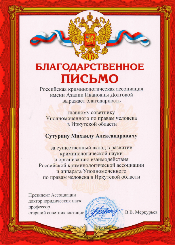 За плодотворное сотрудничество в вопросах развития теории и практики предупреждения преступности, существенный вклад в развитие криминологической науки вручены Благодарности Уполномоченному по правам человека в Иркутской области Семеновой Светлане Николаевне и главному советнику аппарата Сутурину Михаилу Александровичу.