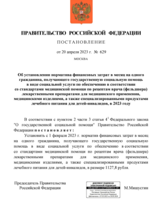 ПОСТАНОВЛЕНИЕ ПРАВИТЕЛЬСТВА РФ ОТ 20 АПРЕЛЯ 2023 Г. № 629 "ОБ УСТАНОВЛЕНИИ НОРМАТИВА ФИНАНСОВЫХ ЗАТРАТ В МЕСЯЦ НА ОДНОГО ГРАЖДАНИНА, ПОЛУЧАЮЩЕГО ГОСУДАРСТВЕННУЮ СОЦИАЛЬНУЮ ПОМОЩЬ В ВИДЕ СОЦИАЛЬНОЙ УСЛУГИ ПО ОБЕСПЕЧЕНИЮ В СООТВЕТСТВИИ СО СТАНДАРТАМИ МЕДИЦИНСКОЙ ПОМОЩИ ПО РЕЦЕПТАМ ВРАЧА (ФЕЛЬДШЕРА) ЛЕКАРСТВЕННЫМИ ПРЕПАРАТАМИ ДЛЯ МЕДИЦИНСКОГО ПРИМЕНЕНИЯ, МЕДИЦИНСКИМИ ИЗДЕЛИЯМИ, А ТАКЖЕ СПЕЦИАЛИЗИРОВАННЫМИ ПРОДУКТАМИ ЛЕЧЕБНОГО ПИТАНИЯ ДЛЯ ДЕТЕЙ-ИНВАЛИДОВ, В 2023 ГОДУ"