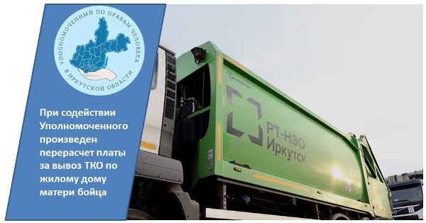 К Уполномоченному по правам человека в Иркутской области Светлане Семеновой обратилась мать военнослужащего, находящегося в зоне СВО, с просьбой оказать содействие в перерасчете платы за вывоз ТКО. Заявительница, с предоставлением документов, обосновала, что начисление платы за вывоз ТКО по адресу принадлежащего ей дома с 1 сентября2019 года производится с нарушением требований законодательства РФ, в том числе в связи с тем, что ей были начислены пени за несвоевременное внесение платежей в период действия моратория, установленного Правительством РФ для предотвращения распространения COVID-19. Взаимодействие Уполномоченного и Службы государственного жилищного и строительного надзора Иркутской области позволило обеспечить проведение ООО «РТ - НЭО Иркутск» перерасчета платы за вывоз ТКО по жилому дому заявительницы в размере более 20 тыс. рублей.