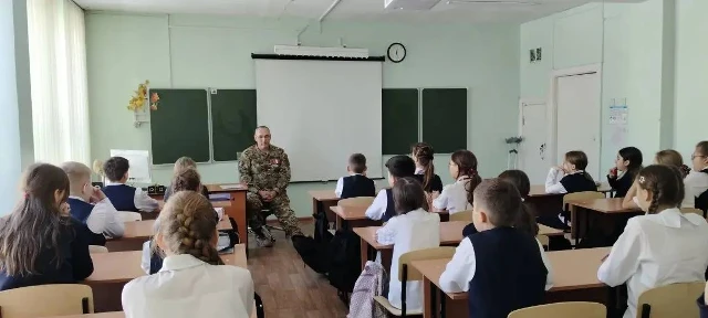 На уроке ветеран поделился своим опытом и рассказал о службе, подвигах и важности защиты Родины, что позволило школьникам глубже осознать понятия долга, чести и служения Родине. Непосредственное общение с ветераном СВО позволило школьникам на конкретном примере увидеть, что настоящие герои живут рядом, что мужество, храбрость и преданность Родине — это качества, доступные каждому.