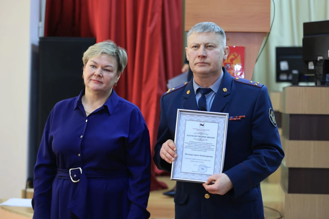 В завершении своего выступления, по поручению Уполномоченного по правам человека в Иркутской области, Оксана Кудрявцева вручила Благодарственное письмо Уполномоченного сотруднику ГУФСИН России по Иркутской области Сергею Молокову за его высокий профессионализм и вклад в дело защиты прав человека.