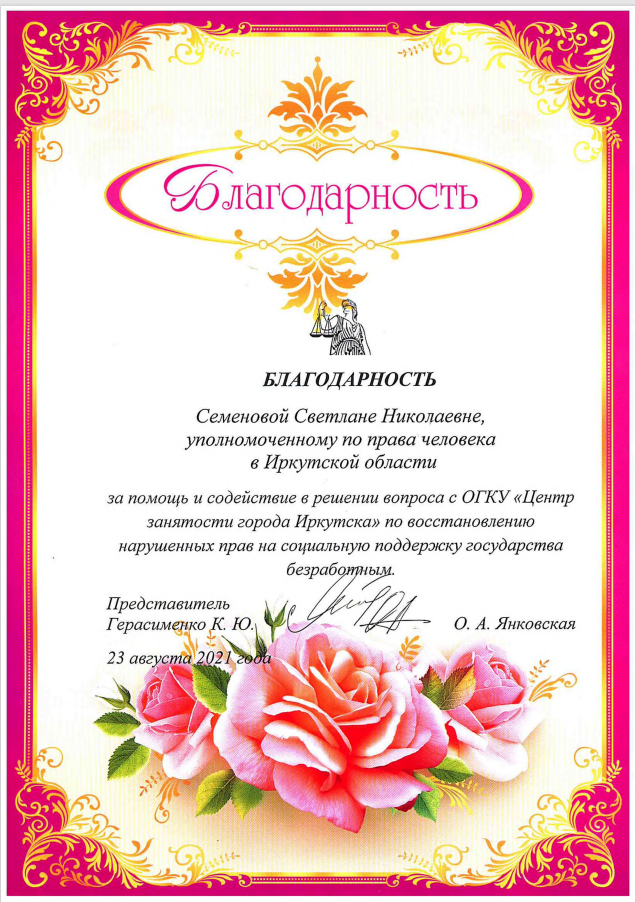 В связи с этим, в адрес Светланы Семеновой поступила Благодарность от заявителя за помощь и содействие по восстановлению нарушенных прав.