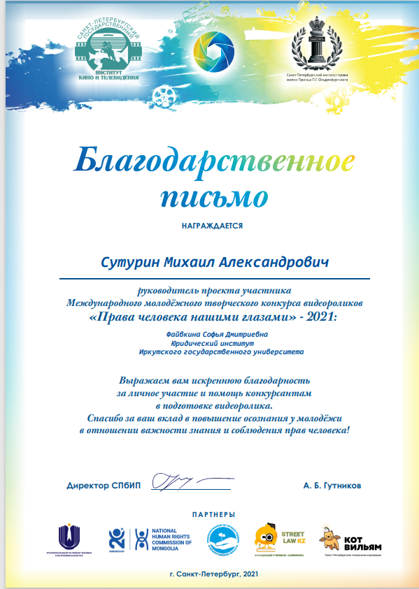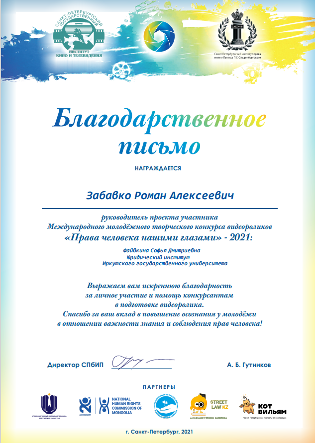 По результатам конкурса высокой оценки жюри заслужил видеоролик, подготовленный студентами Юридического института Иркутского государственного университета Файвкиной Софьей, Куправа Теоной, Гадировой Басирой, Белоусовой Анной. Руководителями данного проекта выступили кандидат юридических наук, доцент кафедры уголовного права Юридического института ИГУ Забавко Роман Алексеевич и кандидат юридических наук, доцент, Главный советник Уполномоченного по правам человека в Иркутской области Сутурин Михаил Александрович.