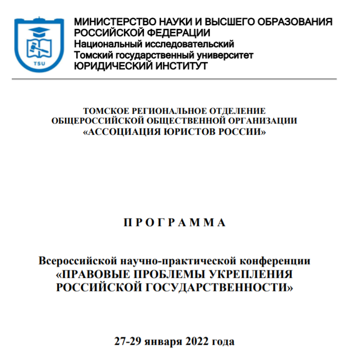 27 – 29 января 2022 года в Юридическом институте Томского государственного университета состоялась Всероссийская научно-практическая конференция «Правовые проблемы укрепления российской государственности».