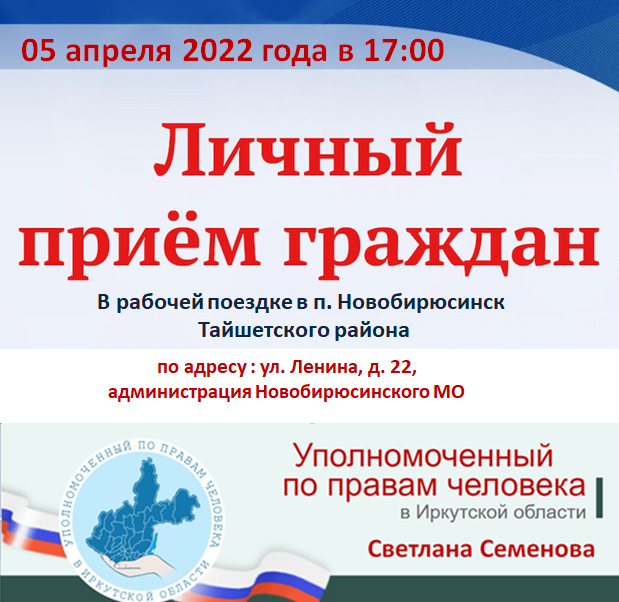 В рамках рабочей поездки 05 апреля состоится Личный приём граждан в п. Новобирюсинск Тайшетского района