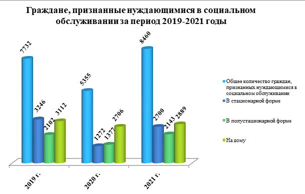 Статистика о гражданах, признанных нуждающимися в социальном обслуживании за 2021 год свидетельствует об увеличении доли граждан, признанных нуждающимися в стационарной форме социального обслуживания, на 8 % по сравнению с 2020 годом.