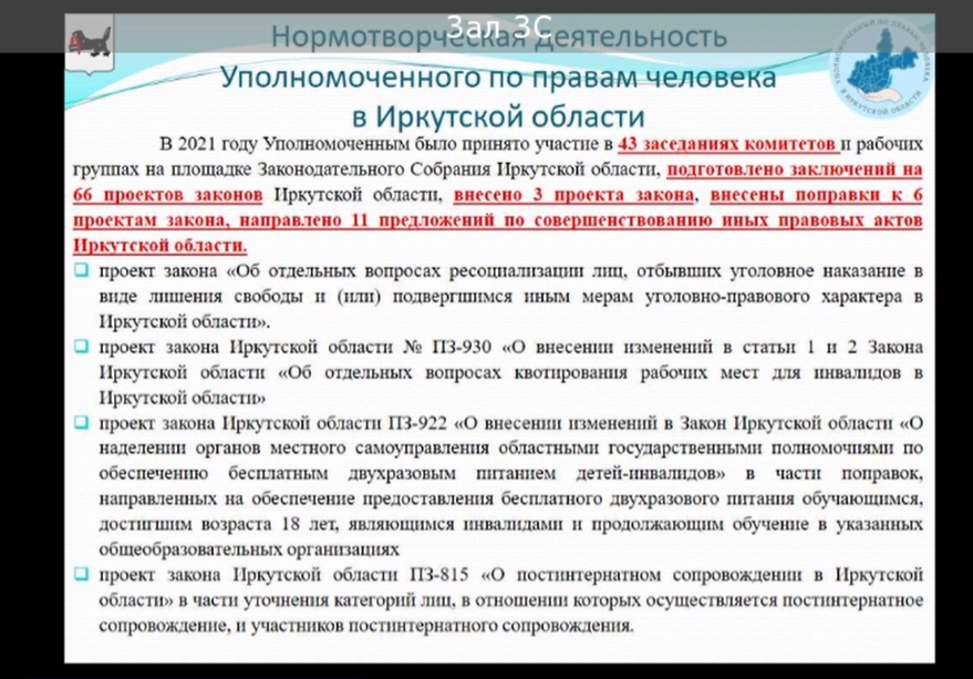 О докладе Уполномоченного на сессии Законодательного собрания Иркутской области