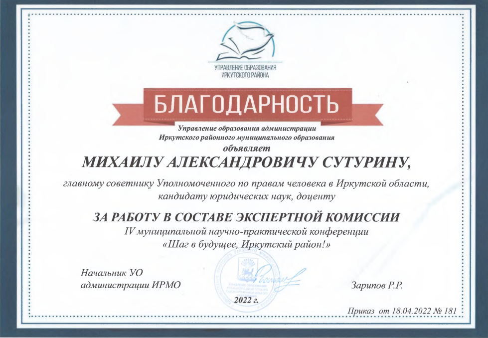 20 апреля 2022 года состоялась IV муниципальная научно-практическая конференции «Шаг в будущее, Иркутский район». В качестве приглашенных экспертов данного мероприятия выступили сотрудники аппарата Уполномоченного по правам человека в Иркутской области.