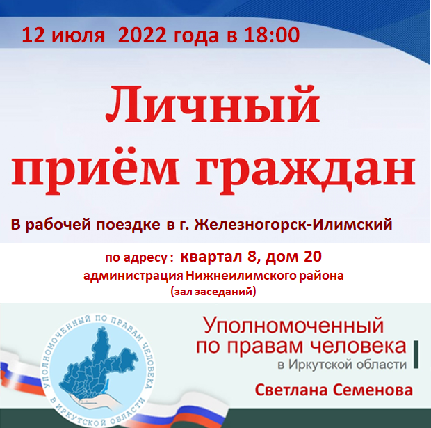 12 июля 2022 г., во вторник в 18.00 в рабочей поездке в Нижнеилимский район состоится ЛИЧНЫЙ ПРИЁМ ГРАЖДАН