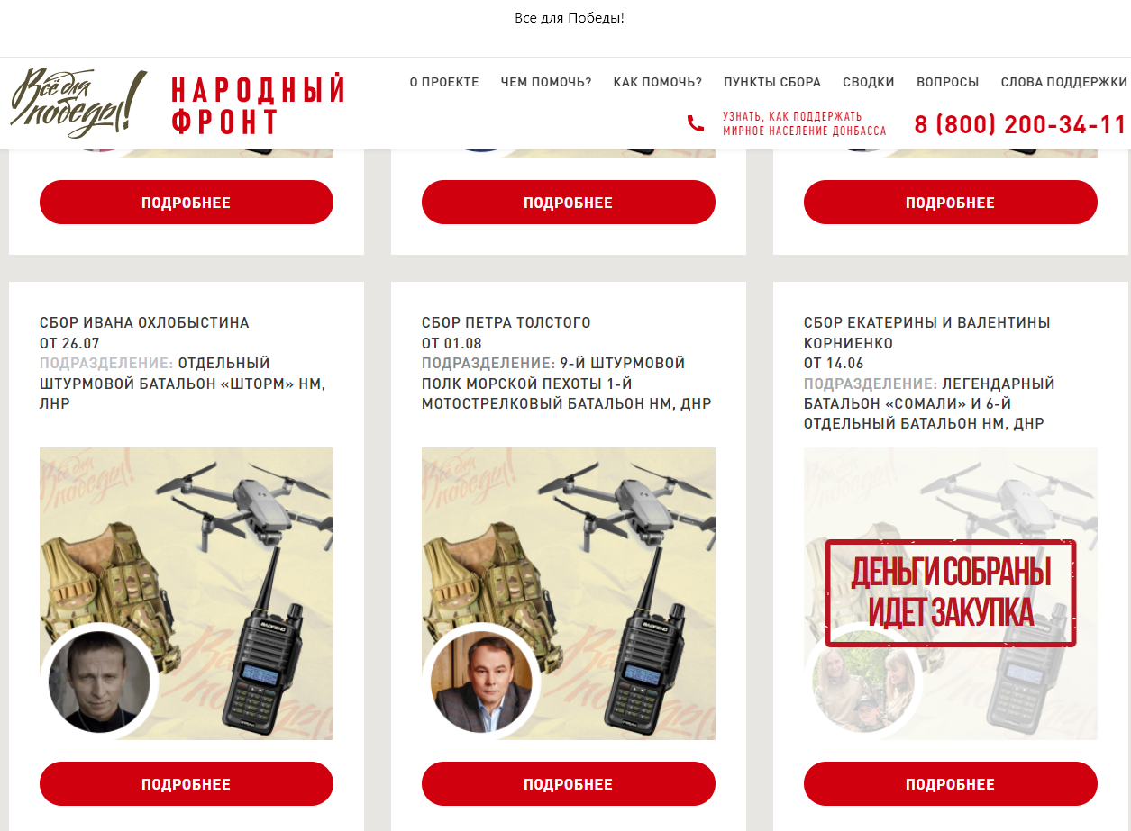 Для поддержки солдат и жителей Донецкой и Луганской народных республик Общероссийский народный фронт запустил проект «ВСЕ ДЛЯ ПОБЕДЫ».
