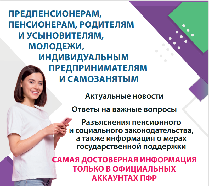 В официальных аккаунтах Пенсионного Фонда Российской Федерации ежедневно размещаются актуальные материалы по ✅пенсионному и ✅социальному обеспечению, ✅ выплатам беременным женщинам и ✅семьям с детьми, ✅информация для федеральных льготников, ✅владельцев сертификатов на материнский (семейный) капитал, ✅разъяснения законодательства по универсальному пособию.