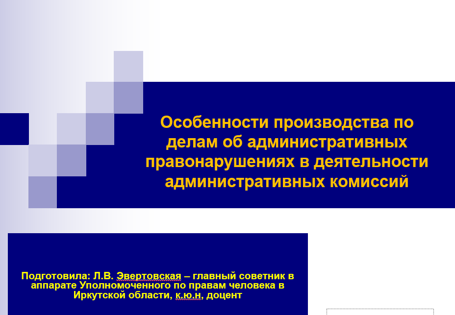 Накануне главный советник аппарата Уполномоченного по правам человека в Иркутской области Лариса Эвертовская приняла участие в работе обучающего семинара в режиме видеконферегцсвязи для ответственных секретарей административных комиссий Иркутской области, выступив с докладом по теме: «Особенности производства по делам об административных правонарушениях в деятельности административных комиссий».