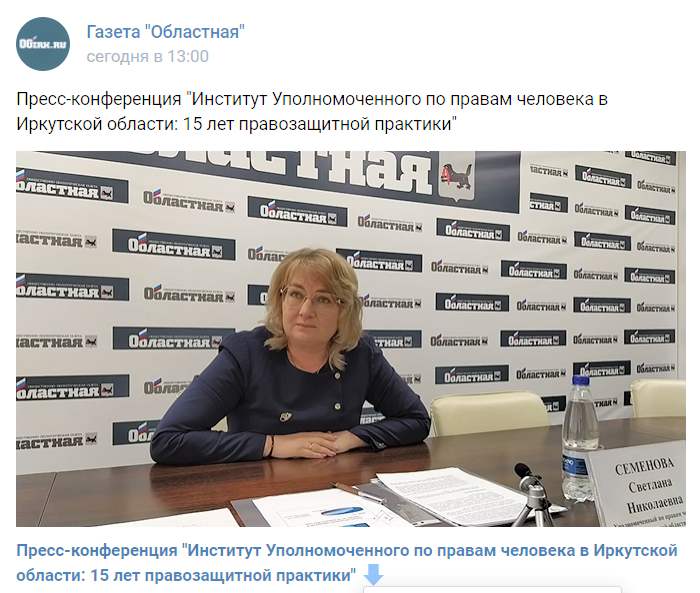 В пресс-центре газеты «Областная» состоялась пресс-конференция Светланы Семеновой на тему: «Институт Уполномоченного по правам человека в Иркутской области: 15 лет правозащитной практики».