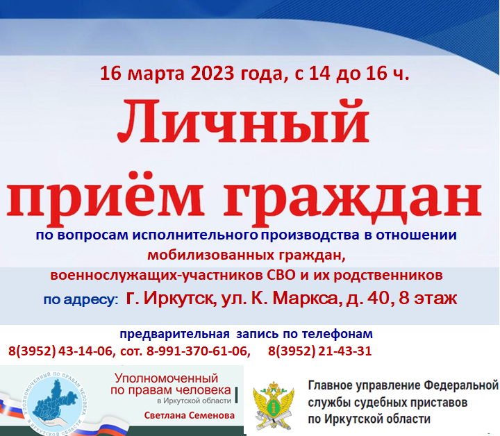 в рамках единого дня приёма ГУ ФССП России по Иркутской области по вопросам, связанным с исполнительными производствами в отношении мобилизованных граждан, военнослужащих- участников СВО и их родственников